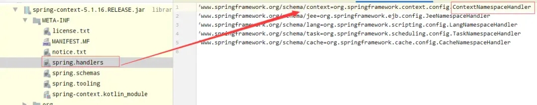 该关系配置在相对于classpath下的/META-INF/spring.handlers中。