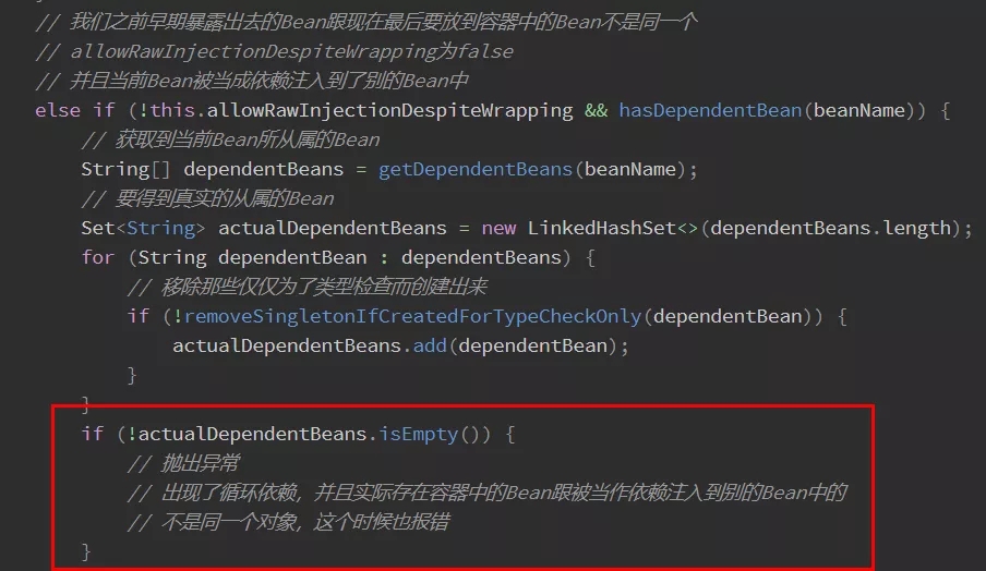 看完上面的代码循环依赖的问题就很明显了,因为早期暴露的对象跟最终放入容器中的对象不是同一个,所以报错了。