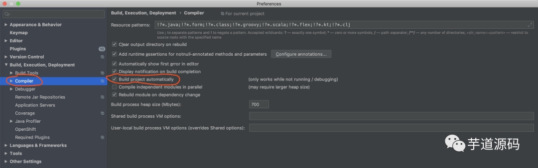 ③ 可能有胖友会觉得手动 Build Project 有点麻烦,IDEA 还提供的自动编译的选项。设置方式,点击 IDEA 的菜单 IntelliJ IDEA -> Preference...,然后选择 Compiler 选项卡,将 Build project automatically 勾选上。如下图所示: