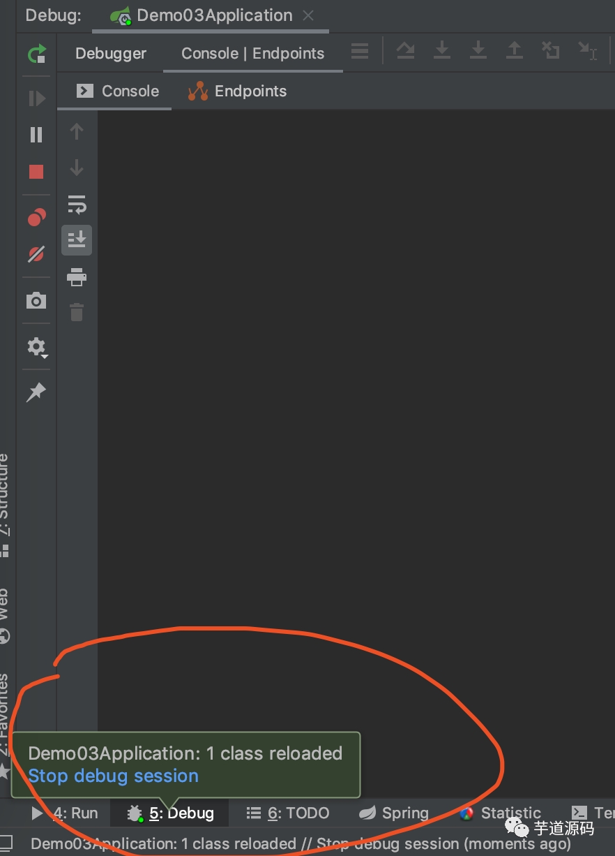 所以一定要 Debug 运行 Spring Boot 项目。具体的效果,胖友自己重复 ① ② 两个步骤,自己尝试下。