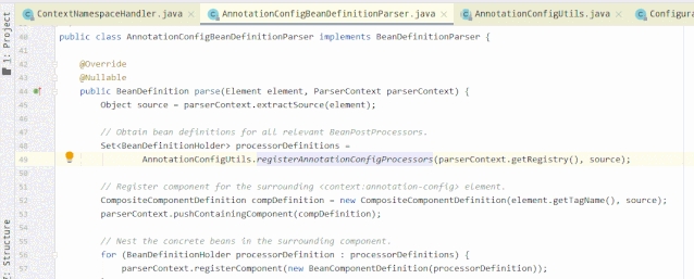 对应AnnotationConfigBeanDefinitionParser这个就是要找的入口