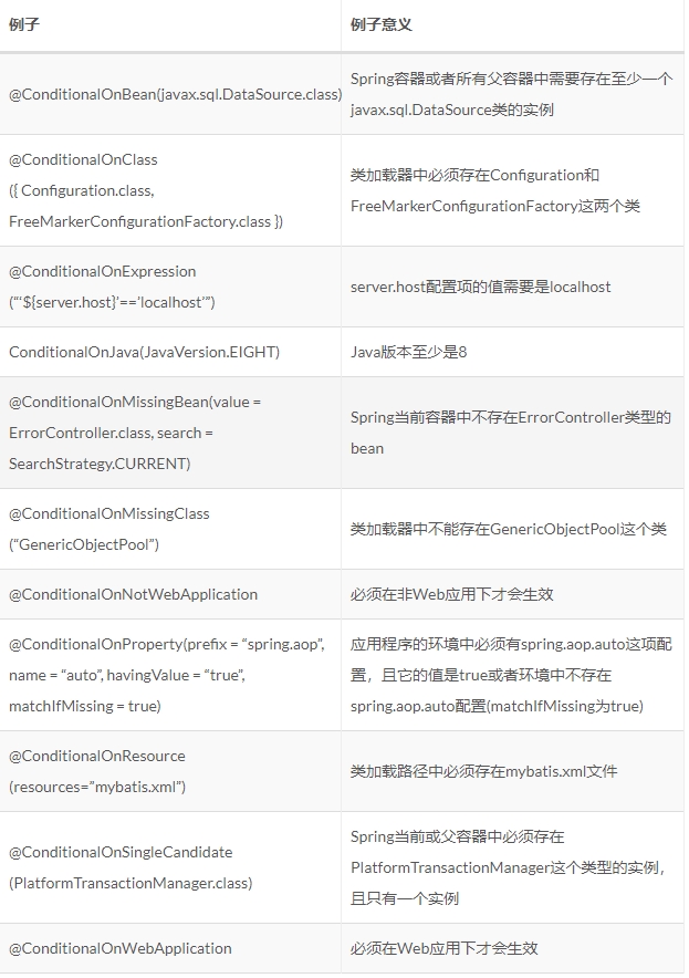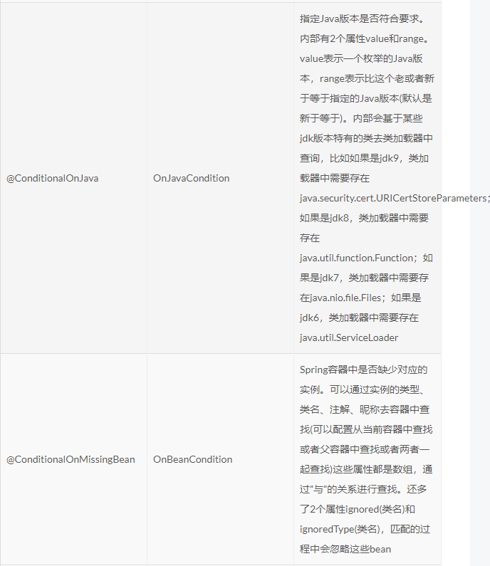 SpringBoot还提供了其他比如ConditionalOnJava、ConditionalOnNotWebApplication、ConditionalOnWebApplication、ConditionalOnResource、ConditionalOnProperty、ConditionalOnExpression等条件注解,有兴趣的读者可以自行查看它们的底层处理逻辑。