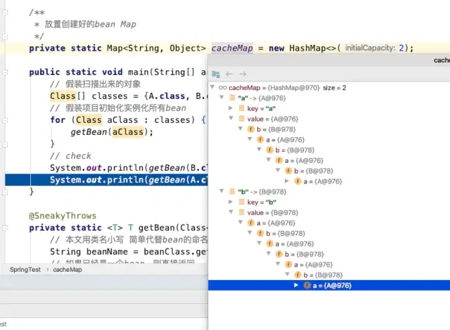 这段代码的效果,其实就是处理了循环依赖,并且处理完成后,cacheMap中放的就是完整的“Bean”了