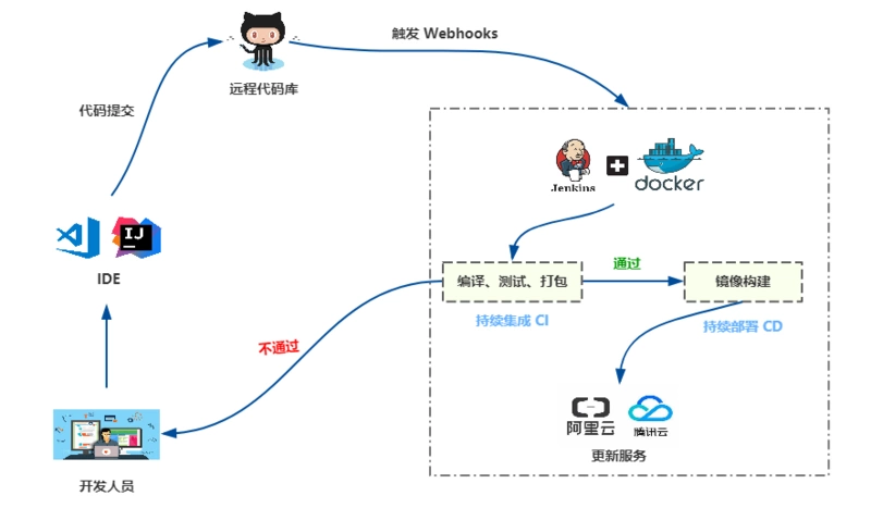 整个过程中,除了代码开发和代码提交这两个步骤是依赖于开发人员的。