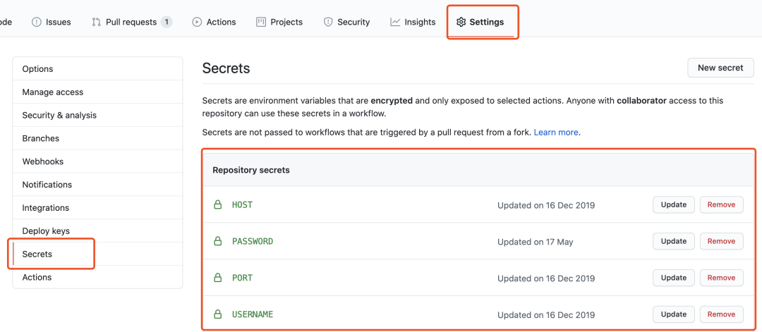 配置文件中前面的内容很容易理解,从 with 开始的部分,涉及到登录个人服务器信息,需要使用账号和密码,那么如果将账号密码明文放在GitHub中,一定会非常不安全,GitHub也不会允许这样的事情出现,于是就有secrets配置