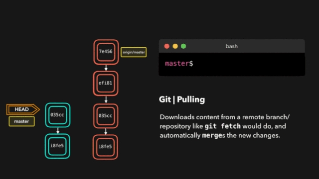 尽管 git fetch 可用于获取某个分支的远程信息,但我们也可以执行 git pull。git pull 实际上是两个命令合成了一个:git fetch 和 git merge。当我们从来源拉取修改时,我们首先是像 git fetch 那样取回所有数据,然后最新的修改会自动合并到本地分支中。