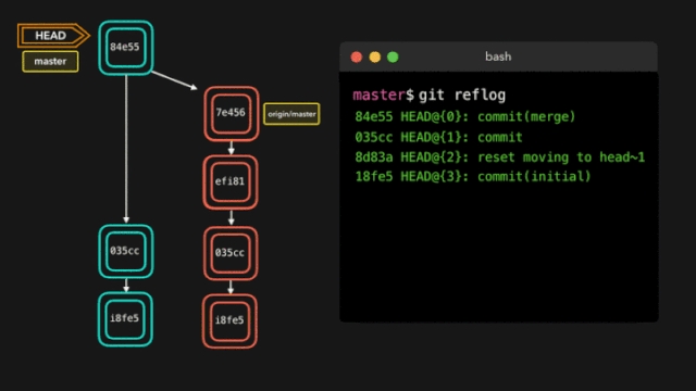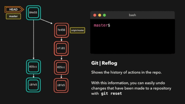 git reflog 是一个非常有用的命令,可以展示已经执行过的所有动作的日志。包括合并、重置、还原,基本上包含你对你的分支所做的任何修改。
