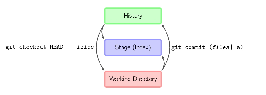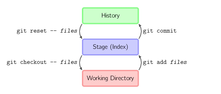 git add *files*把当前文件放入暂存区域。git commit给暂存区域生成快照并提交。git reset -- *files*用来撤销最后一次git add *files*,你也可以用git reset撤销所有暂存区域文件。git checkout -- *files*把文件从暂存区域复制到工作目录,用来丢弃本地修改。
