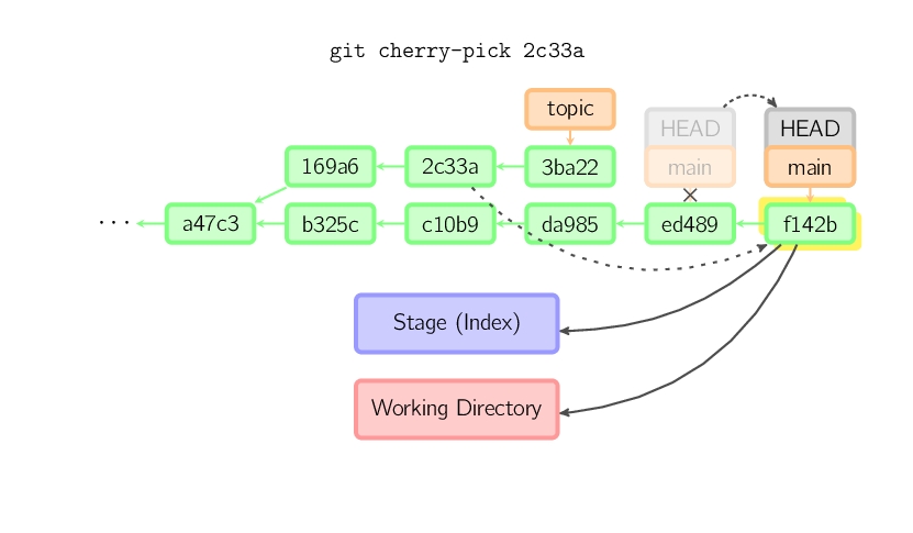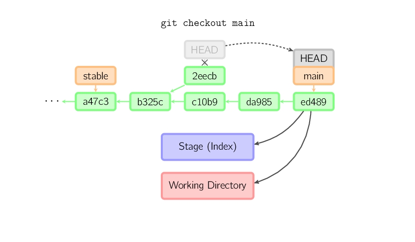 一旦此后你切换到别的分支,比如说main,那么这个提交节点(可能)再也不会被引用到,然后就会被丢弃掉了。注意这个命令之后就不会有东西引用2eecb。