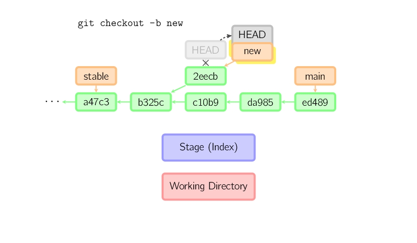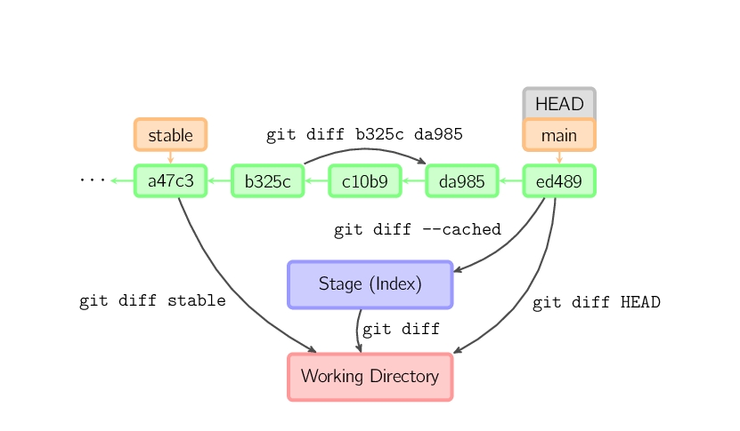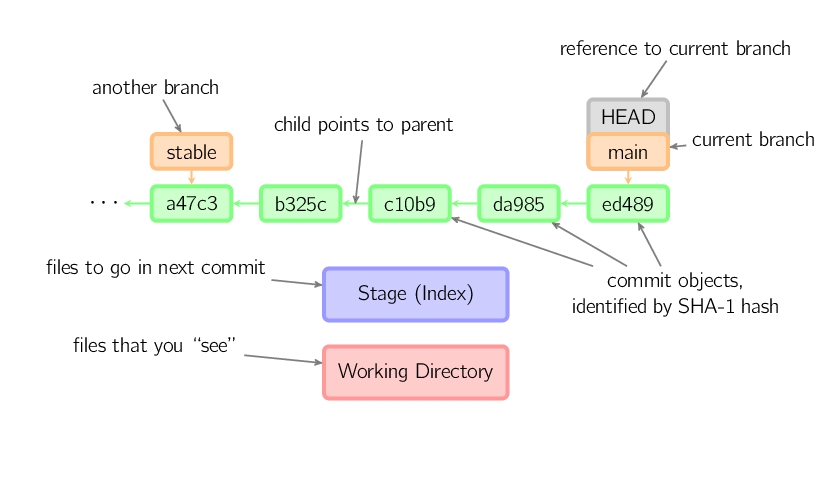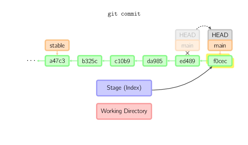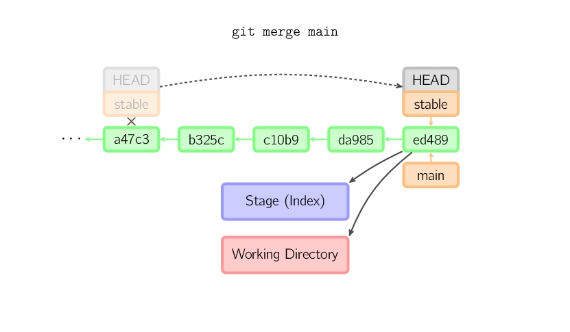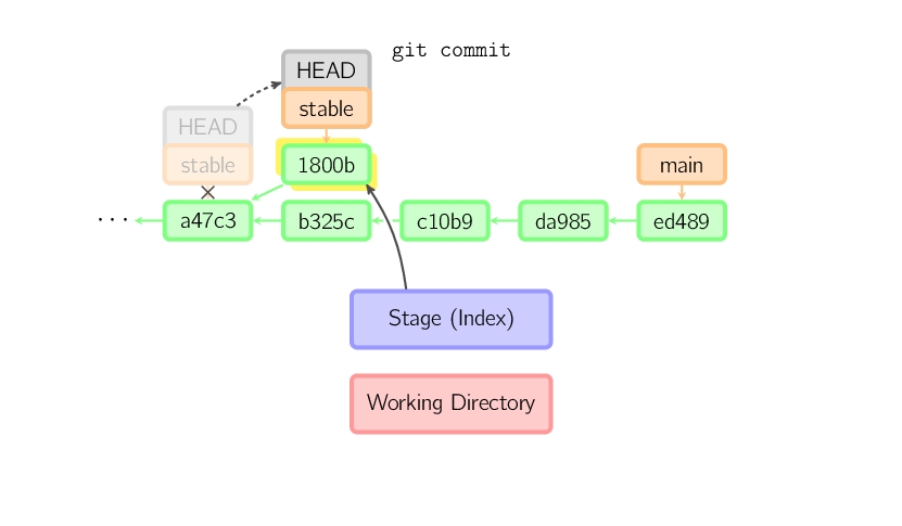 绿色的5位字符表示提交的ID,分别指向父节点。分支用橘色显示,分别指向特定的提交。当前分支由附在其上的HEAD标识。 这张图片里显示最后5次提交,ed489是最新提交。 main分支指向此次提交,另一个stable分支指向祖父提交节点。