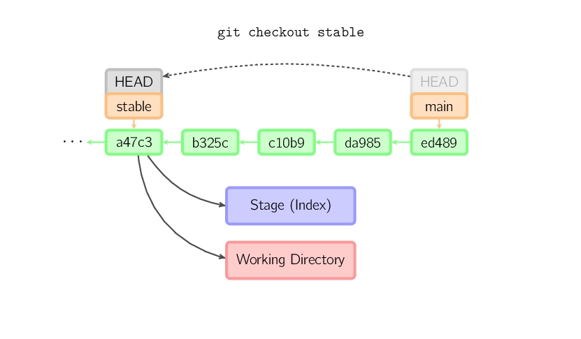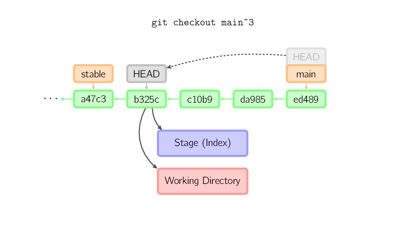 如果既没有指定文件名,也没有指定分支名,而是一个标签、远程分支、SHA-1值或者是像main~3类似的东西,就得到一个匿名分支,称作detached HEAD(被分离的HEAD标识)。这样可以很方便地在历史版本之间互相切换。比如说你想要编译1.6.6.1版本的git,你可以运行git checkout v1.6.6.1(这是一个标签,而非分支名),编译,安装,然后切换回另一个分支,比如说git checkout main。然而,当提交操作涉及到“分离的HEAD”时,其行为会略有不同,详情见在下面。