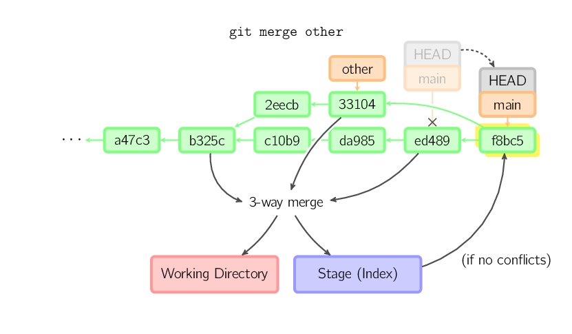 否则就是一次真正的合并。默认把当前提交(ed489 如下所示)和另一个提交(33104)以及他们的共同祖父节点(b325c)进行一次三方合并。结果是先保存当前目录和索引,然后和父节点33104一起做一次新提交。