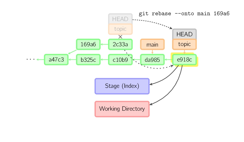要限制回滚范围,使用--onto选项。下面的命令在main分支上重演当前分支从169a6以来的最近几个提交,即2c33a。
