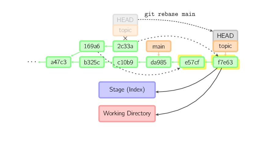 上面的命令都在topic分支中进行,而不是main分支,在main分支上重演,并且把分支指向新的节点。注意旧提交没有被引用,将被回收。