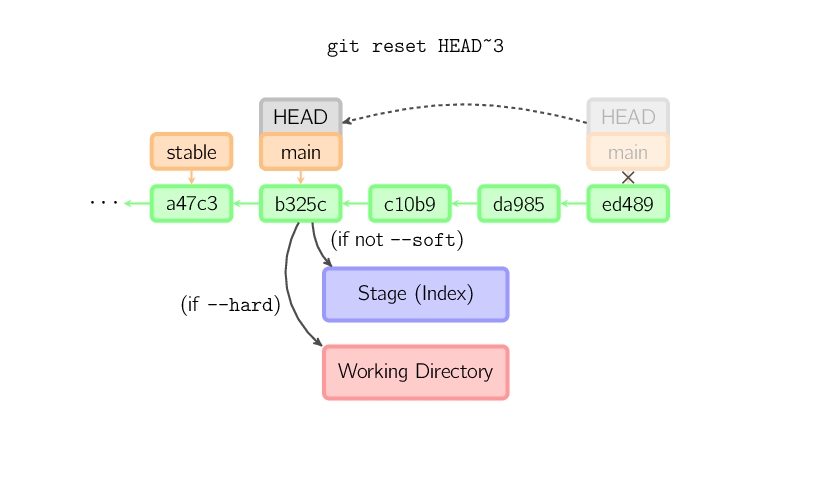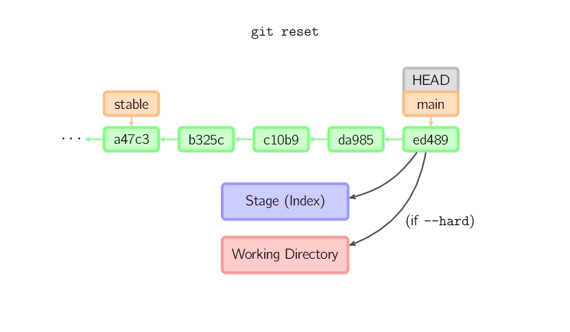 如果没有给出提交点的版本号,那么默认用HEAD。这样,分支指向不变,但是索引会回滚到最后一次提交,如果用--hard选项,工作目录也同样。