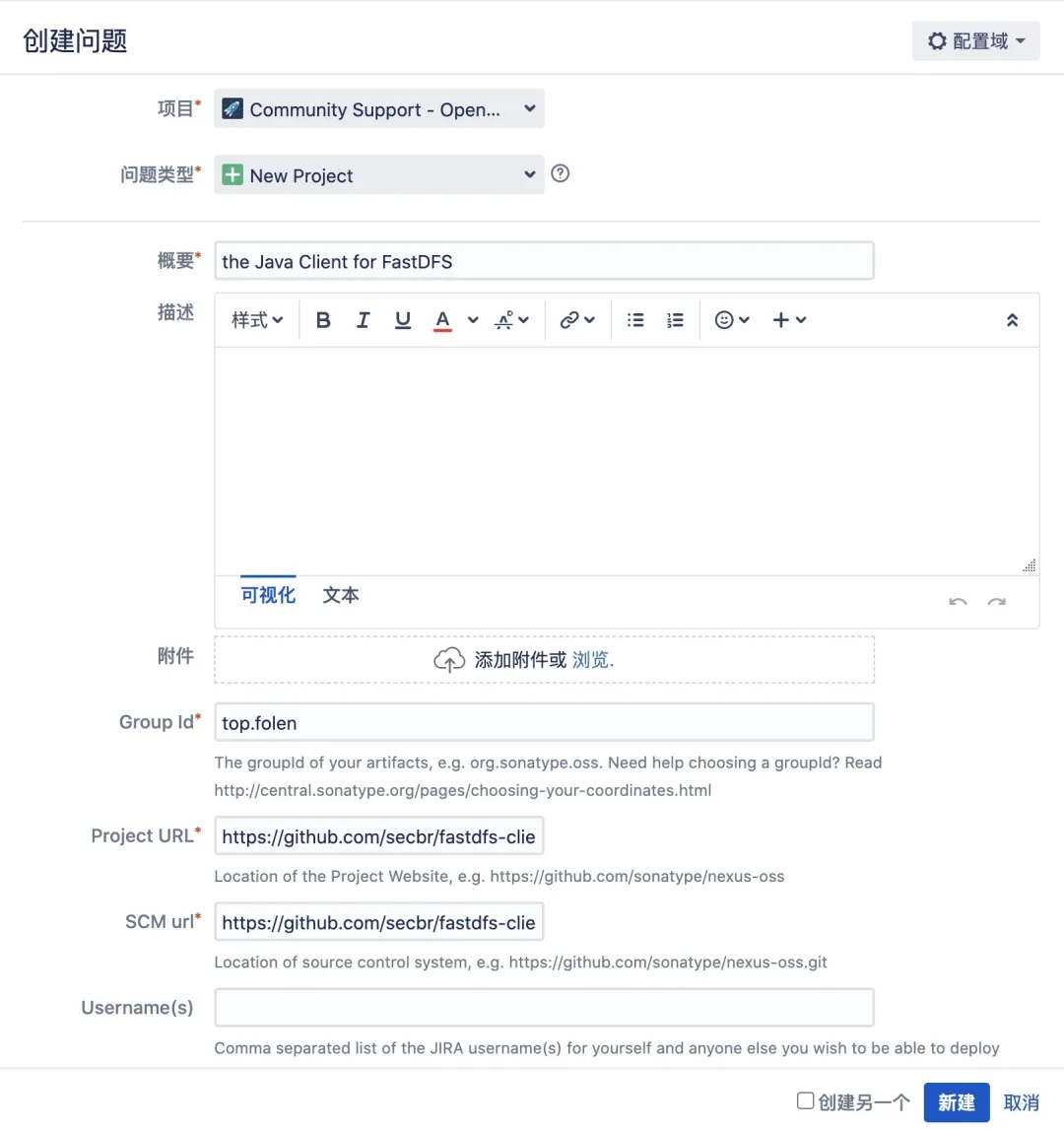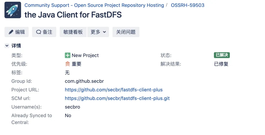 通过在JIRA上创建issue来申请发布新的jar包,Sonatype的工作人员会进行审核,一般按照要求填写不会有问题。