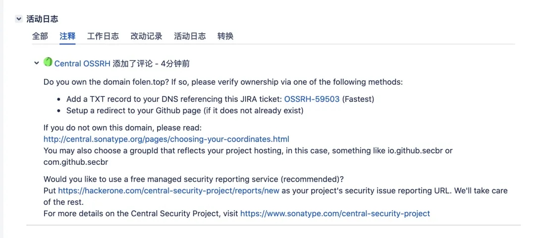 这里主要是为验证上面的GroupId,来确定对应的域名是否是你所拥有的,比如这里填写的GroupId为top.folen。那么需要验证的域名便是:folen.top。