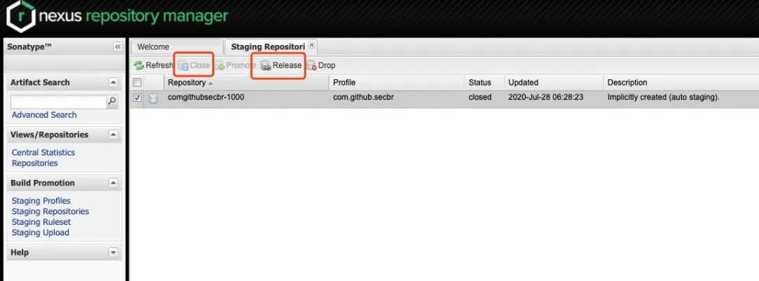 选中对于的repository之后,点击的close,close时会检查发布的构件是否符合要求。若符合要求,则close成功,成功之后点击箭头所指的release,即可正式将jar包发布到Sonatype OSSRH仓库。