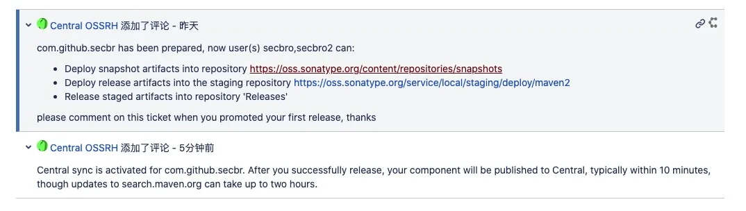 当发布到Maven中央仓库完成,可以看到对应的Jar包时,可以对自己提交的Issue增加Comment,留言致谢并表示发布已经完成,请工作人员关闭Issue。有始有终。