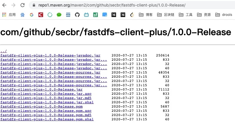 此时访问上面的任何一个链接,便查询对应的信息。比如将url中的具体文件去掉,只留如下路径:https://oss.sonatype.org/content/repositories/snapshots/com/github/secbr/fastdfs-client-plus/1.0.0-SNAPSHOT/