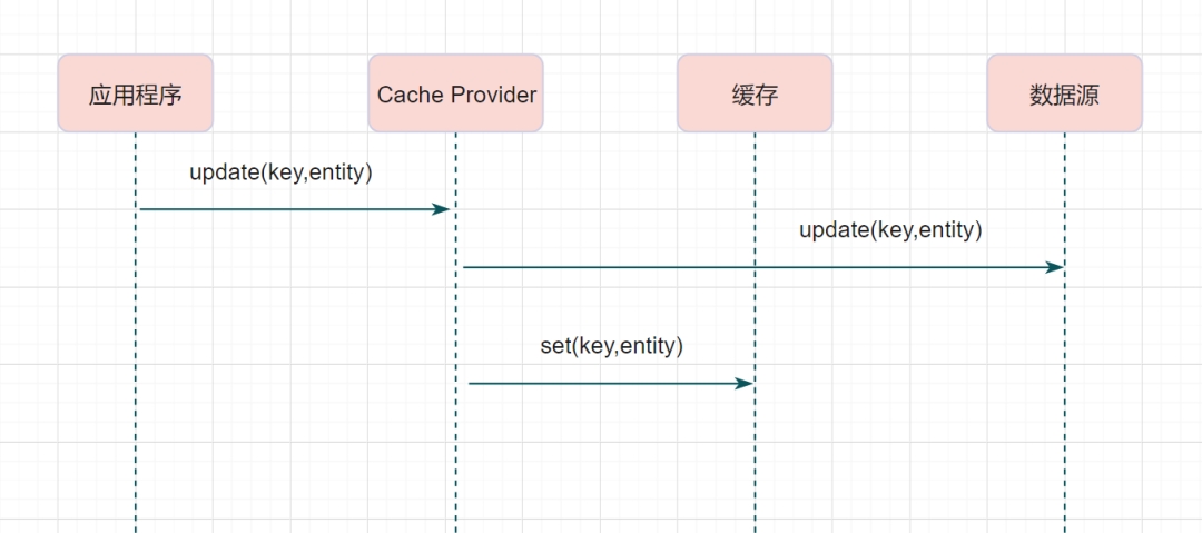 Write-Through模式下,当发生写请求时,也是由缓存抽象层完成数据源和缓存数据的更新,流程如下: