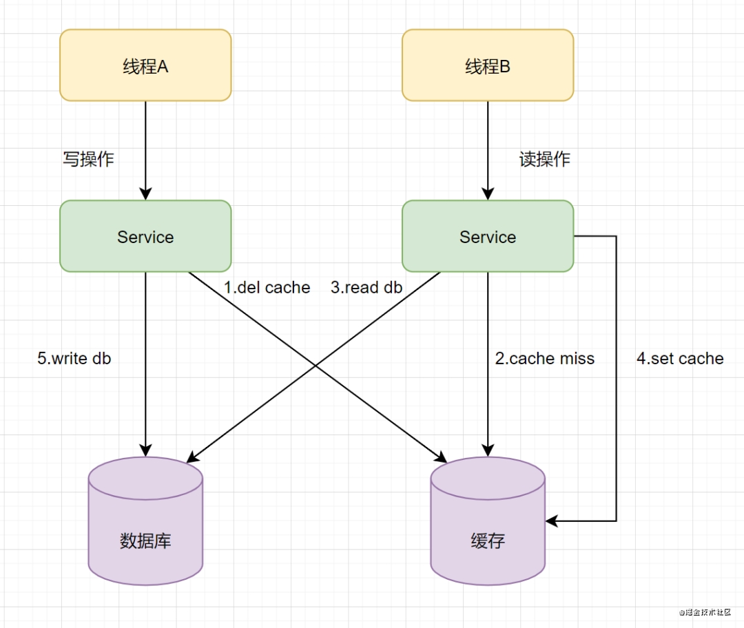 这时候,缓存保存的是A的数据(老数据),数据库保存的是B的数据(新数据),数据不一致了,脏数据出现啦。如果是删除缓存取代更新缓存则不会出现这个脏数据问题。