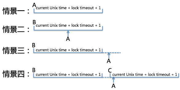 如果在此之前,另一个线程C快一步执行了上面的操作,那么A拿到的时间戳是个未超时的值,这时A没有如期获得锁,需要再次等待或重试。