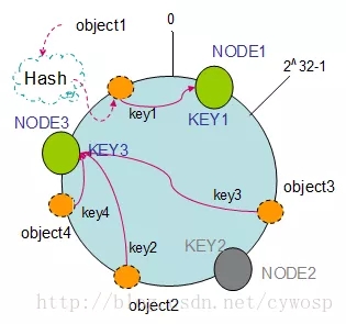 通过上图可以看出对象与机器处于同一哈希空间中,这样按顺时针转动object1存储到了NODE1中,object3存储到了NODE2中,object2、object4存储到了NODE3中。在这样的部署环境中,hash环是不会变更的,因此,通过算出对象的hash值就能快速的定位到对应的机器中,这样就能找到对象真正的存储位置了。