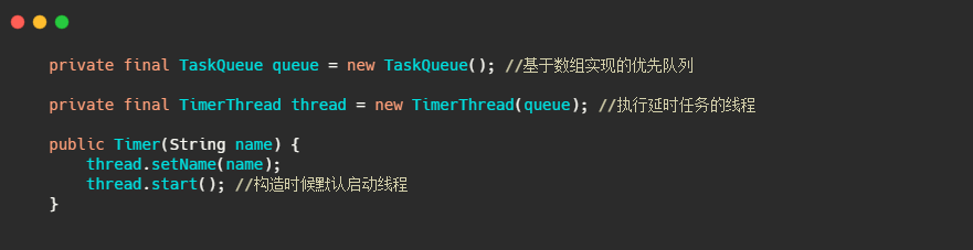 核心就是一个优先队列和封装的执行任务的线程,从这我们也可以看到一个 Timer 只有一个线程执行任务。