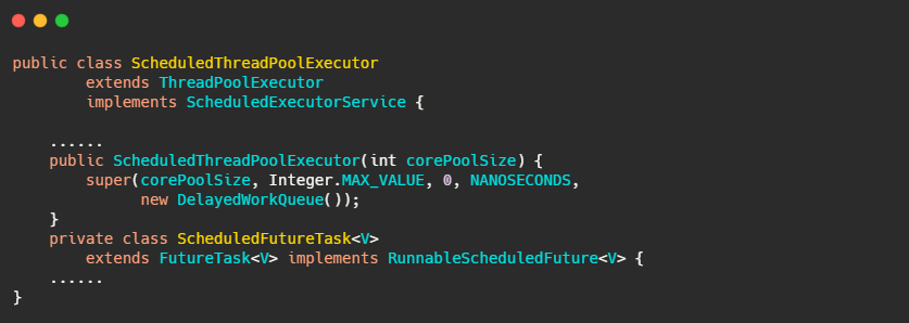 继承了 ThreadPoolExecutor,实现了 ScheduledExecutorService。可以定性操作就是正常线程池差不多了。区别就在于两点,一个是 ScheduledFutureTask ,一个是 DelayedWorkQueue。