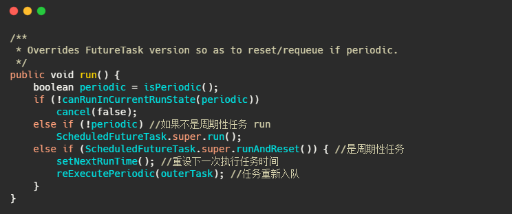 其实 DelayedWorkQueue 就是优先队列,也是利用数组实现的小顶堆。而 ScheduledFutureTask 继承自 FutureTask 重写了 run 方法,实现了周期性任务的需求。