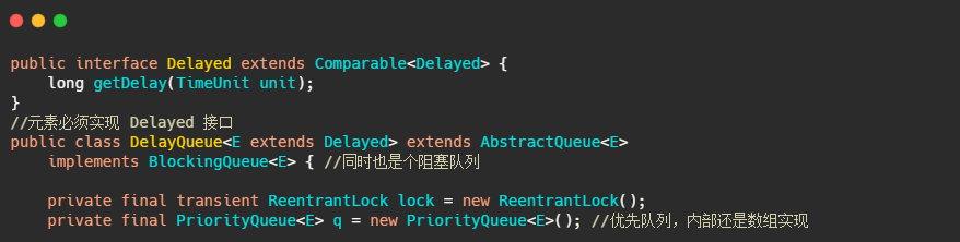 Java 中还有个延迟队列 DelayQueue,加入延迟队列的元素都必须实现 Delayed 接口。延迟队列内部是利用 PriorityQueue 实现的,所以还是利用优先队列!Delayed 接口继承了Comparable 因此优先队列是通过 delay 来排序的。
