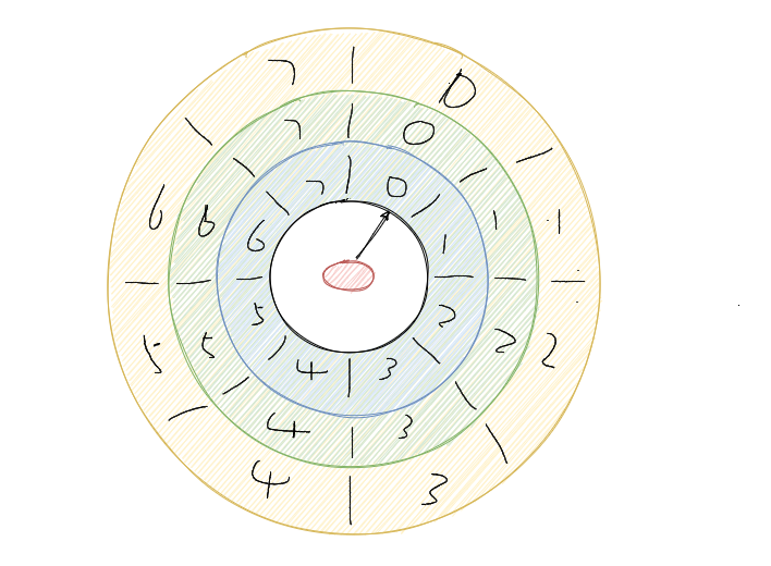 多层次时间轮就是这样实现的。假设上图就是第一层,那么第一层走了一圈,第二层就走一格。