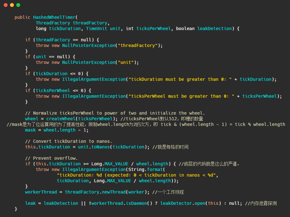 在 Netty 中时间轮的实现类是 HashedWheelTimer,代码中的 wheel 就是上图画的循环数组,mask 的设计和HashMap一样,通过限制数组的大小为2的次方,利用位运算来替代取模运算,提高性能。tickDuration 就是每格的时间即精度。可以看到配备了一个工作线程来处理任务的执行。