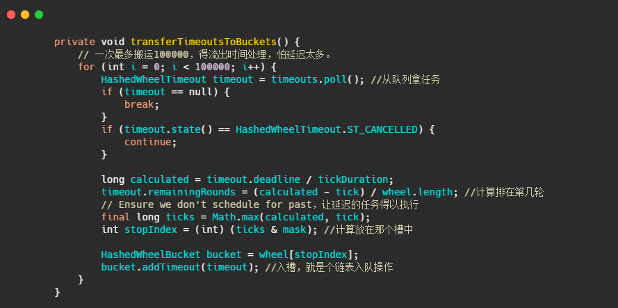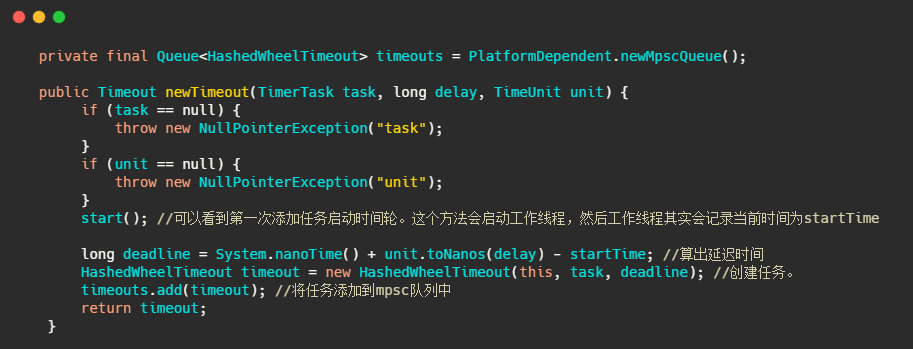 可以看到任务并没有直接添加到时间轮中,而是先入了一个 mpsc 队列,我简单说下 mpsc 是 JCTools 中的并发队列,用在多个生产者可同时访问队列,但只有一个消费者会访问队列的情况。篇幅有限,有兴趣的朋友自行了解实现。