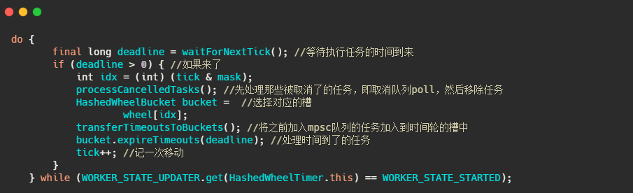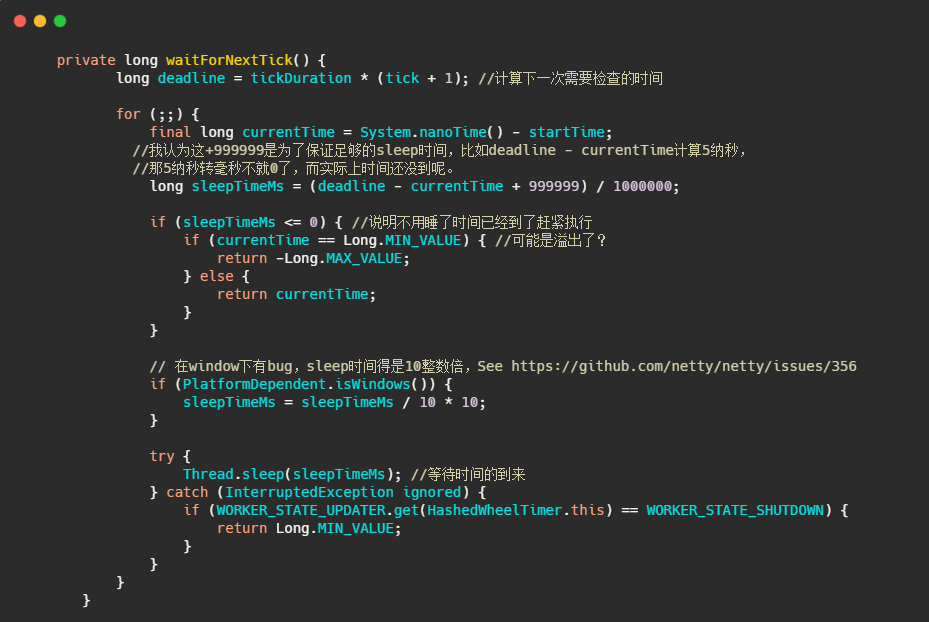 简单的说就是通过 tickDuration 和此时已经滴答的次数算出下一次需要检查的时间,时候未到就sleep等着。