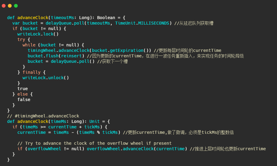 从上面的 add 方法我们知道每次对比都是根据expiration < currentTime + interval 来进行对比的,而advanceClock 就是用来推进更新 currentTime 的。