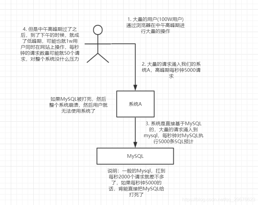 场景描述:每天 0 点到 11 点,系统A风平浪静,每秒并发请求数量就 100 个。结果每一一到11点到1点,每秒并发请求数量就会暴增大1万条 。但是系统最大的处理能力就只能每秒钟处理1000个请求。