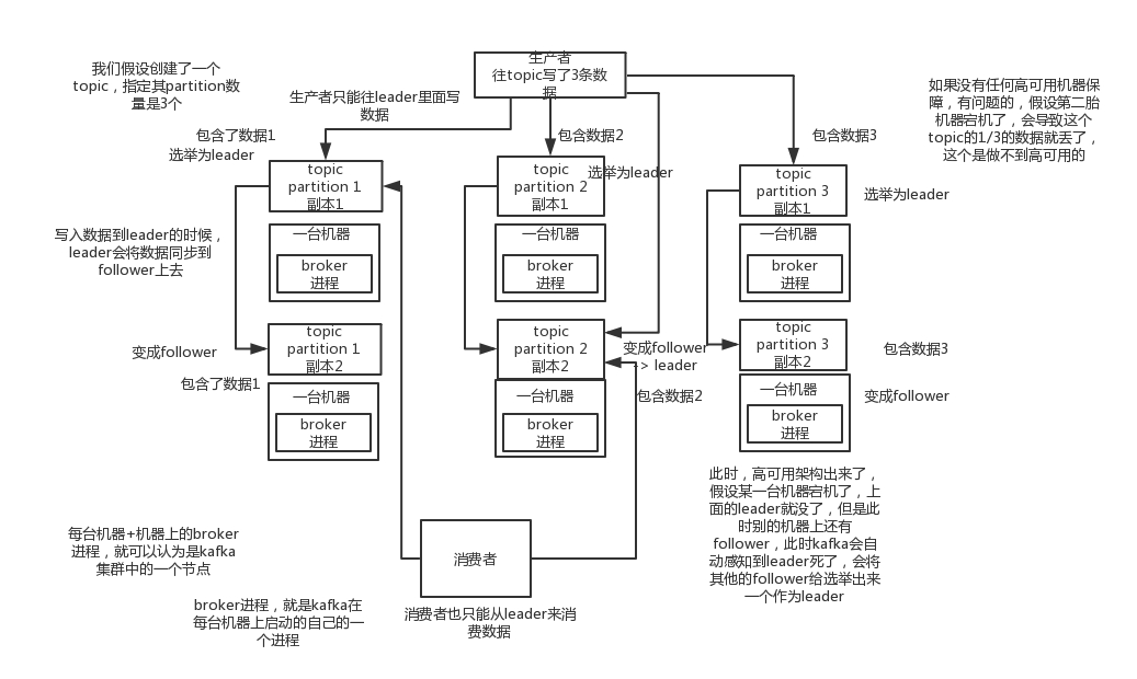 这么搞,就有所谓的高可用性了,因为如果某个broker宕机了,没事儿,那个broker上面的partition在其他机器上都有副本的,如果这上面有某个partition的leader,那么此时会重新选举一个新的leader出来,大家继续读写那个新的leader即可。这就有所谓的高可用性了。