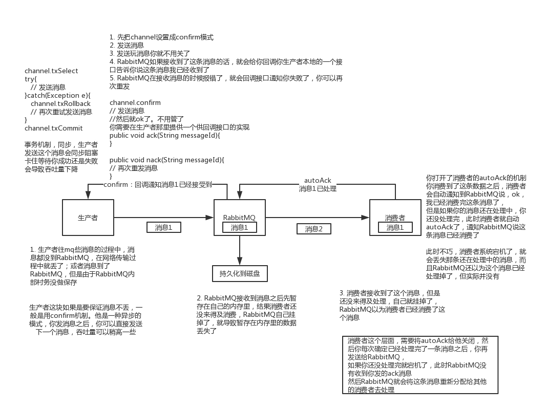 哪怕是你给rabbitmq开启了持久化机制,也有一种可能,就是这个消息写到了rabbitmq中,但是还没来得及持久化到磁盘上,结果不巧,此时rabbitmq挂了,就会导致内存里的一点点数据会丢失。
