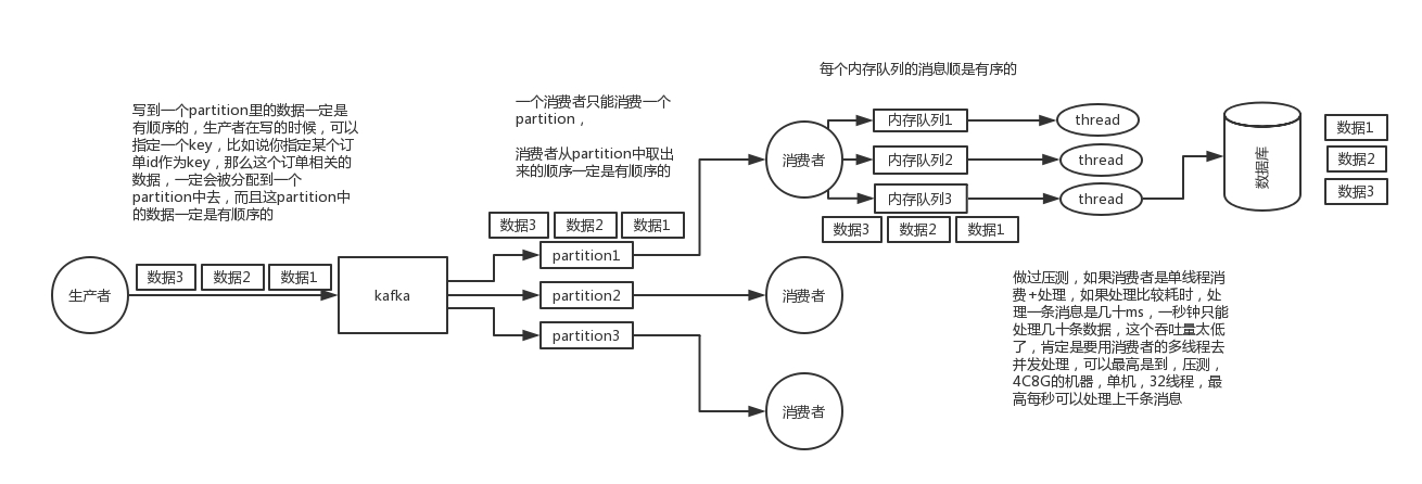 (2)kafka:一个topic,一个partition,一个consumer,内部单线程消费,写N个内存queue,然后N个线程分别消费一个内存queue即可