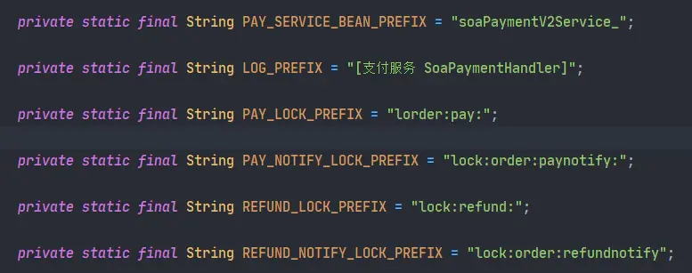 要删除Key,首先就要精准的定位出哪些Key需要删除,如果勿删Key,会影响到其他服务正常运转!如果Key本身设置了过期时间,但有些数据需是持久化的。然而那该死的项目经理一直催项目进度,导致开发人员在开发过程中很多地方都没有设计到位,比如Redis Key散落在项目代码的每个角落;比如命名不是很规范。真不知道是怎么review代码!哦,想必是没有时间review,那该死的项目经理…… 我随便截个支付服务中的Key命名: